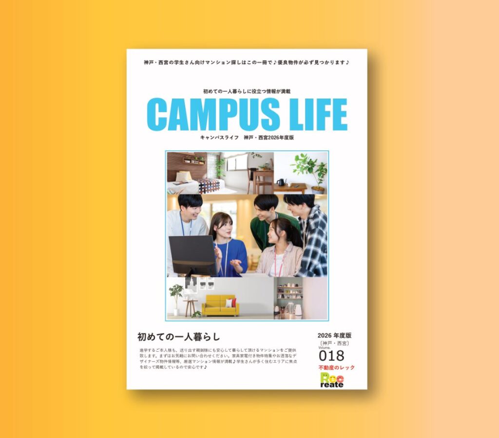 2026年度版CAMPUS LIFEが完成しました。神戸・西宮の各大学・専門学校の方向けの物件情報雑誌です。各エリア毎のオススメ物件や、家具家電付き物件特集、各エリア豆知識など、お役立ち情報が満載です。